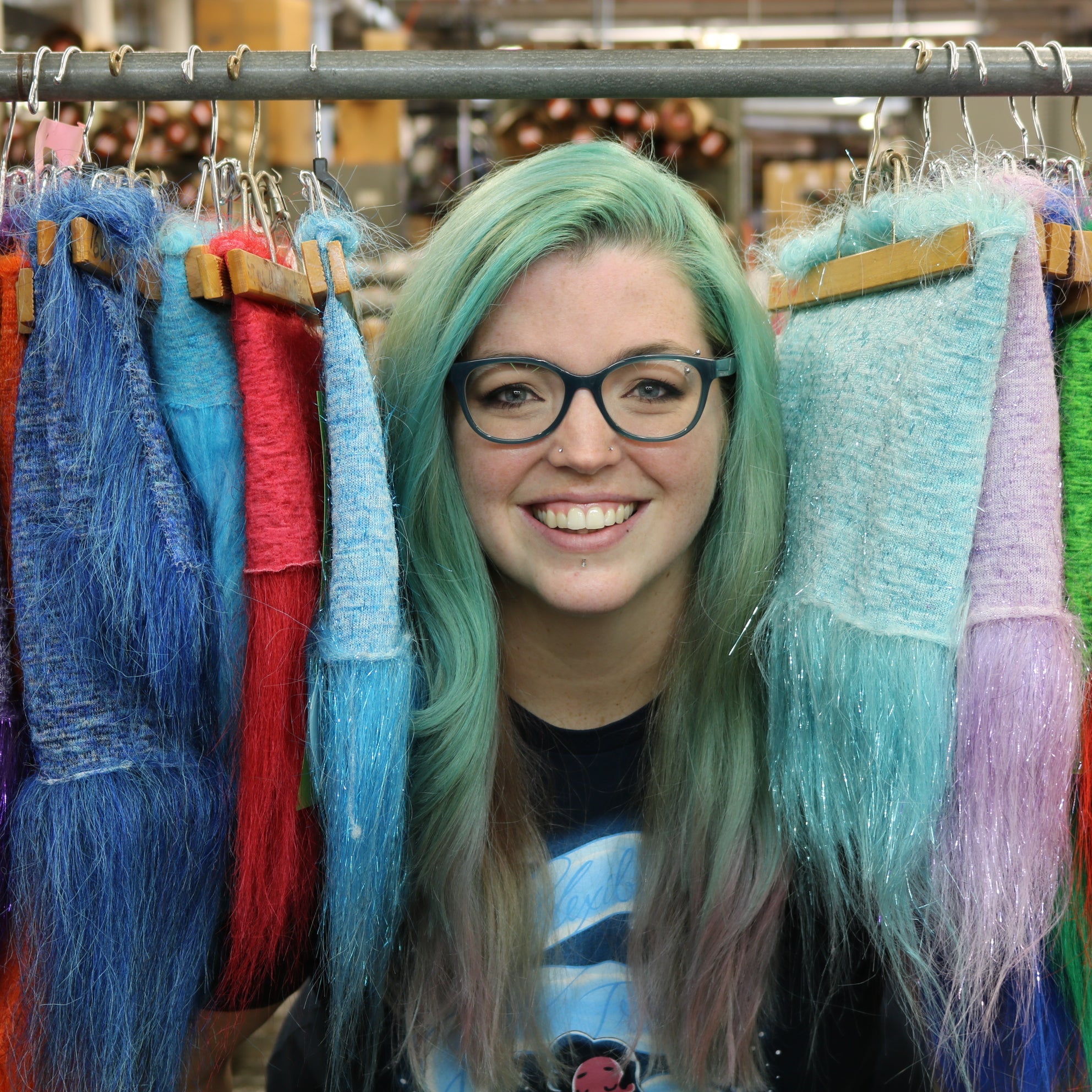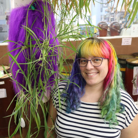 Abby (she/her) has been working at NFT since 2013. In the shop she wears many hats, including (but not limited to) production manager, knitter lead, samples supervisor, and social media coordinator. In her free time, Abby enjoys movies and TV, cosplay, and snuggling with her two cats: Finn and Poe.